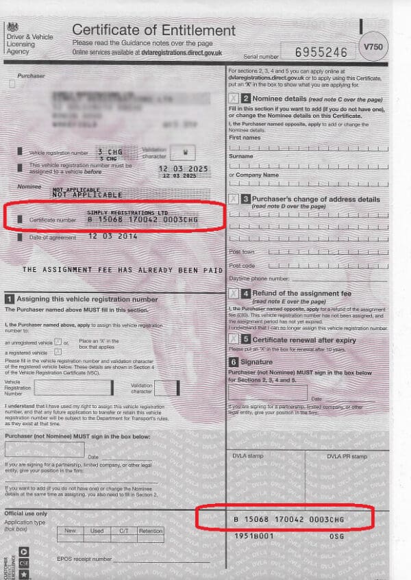 - a certificate of entitlement (V750) to the number